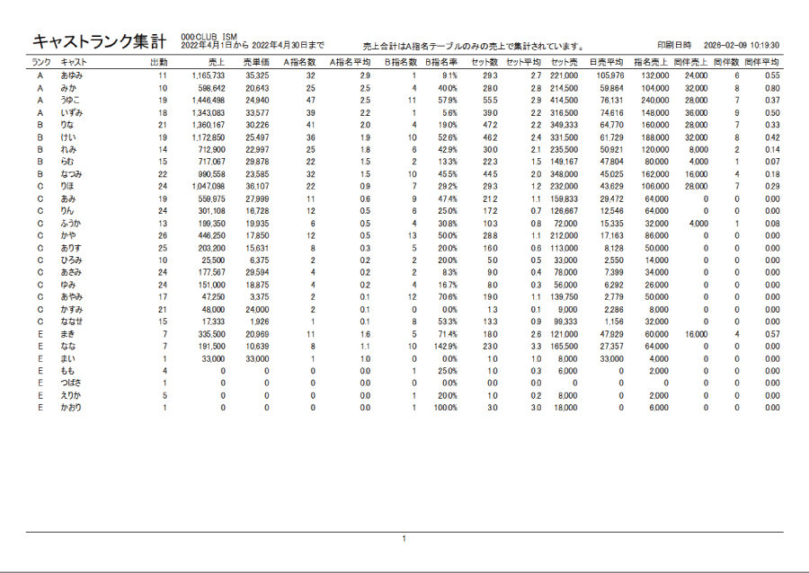 『帳票』→『分析』→『キャストランク集計』から集計期間を指定して集計・A4印刷・CSV出力できます。