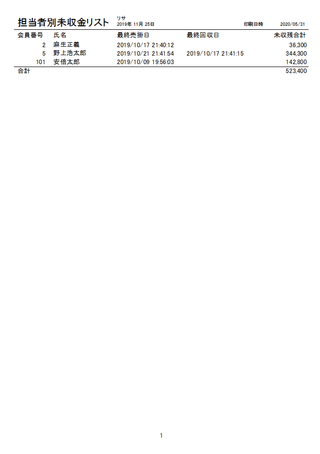 「売掛金処理」 担当者別にお客様の売掛金残高を集計しA4印刷、CSV出力ができます。 ≪担当者別未収金リスト≫ 1、「帳票」→「月報印刷」→「担当者別未収金リスト」画面を開き、担当者と日付を指定して「集計」ボタンを押すと、その日までの担当者のお客様の未収金(売掛金残高)リストが表示されます。必要に応じて出力してください。※顧客情報に担当者を登録していないとリストに集計されませんのでご注意ください。 「印刷画面」 【拡大】